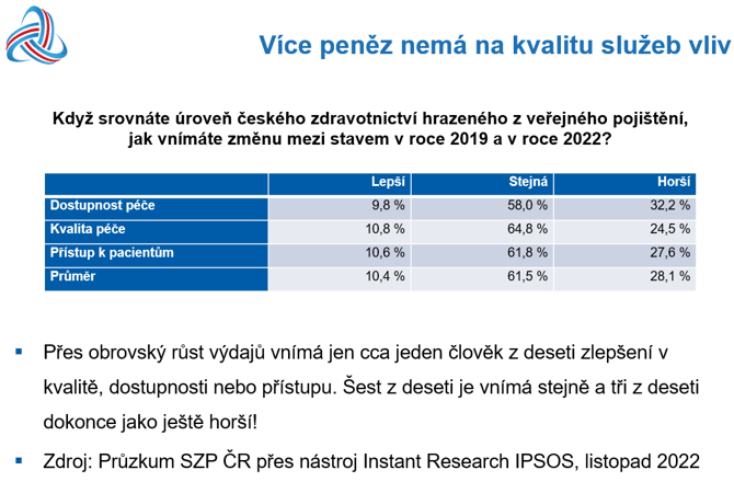 "Od roku 2016 jsou celkové náklady dvojnásobné, protože rostou výrazně rychleji než ekonomika i inflace. Paradoxně ale s náklady nestoupá dostupnost ani vnímaná kvalita, což ukázal náš loňský průzkum," popisuje stav českého zdravotnictví Ladislav Friedrich, prezident Svazu zdravotních pojišťoven.
