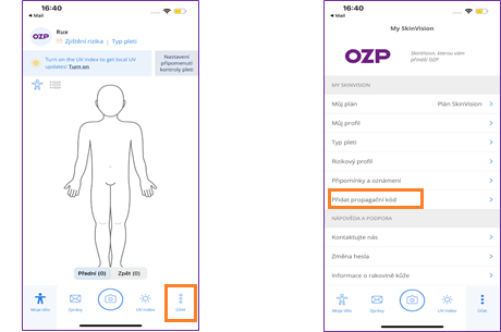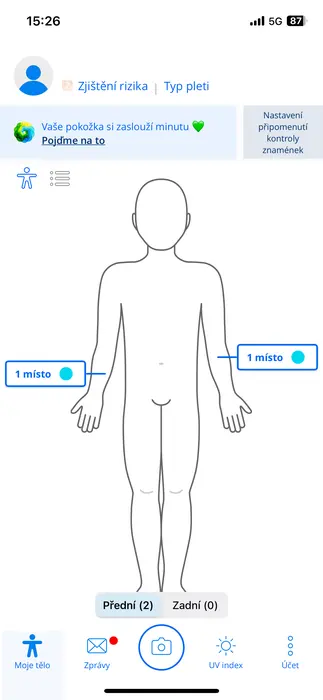 V aplikaci kliknete na ikonu fotoaparátu a na Mapě těla si vyberete místo, kde budete skenovat své